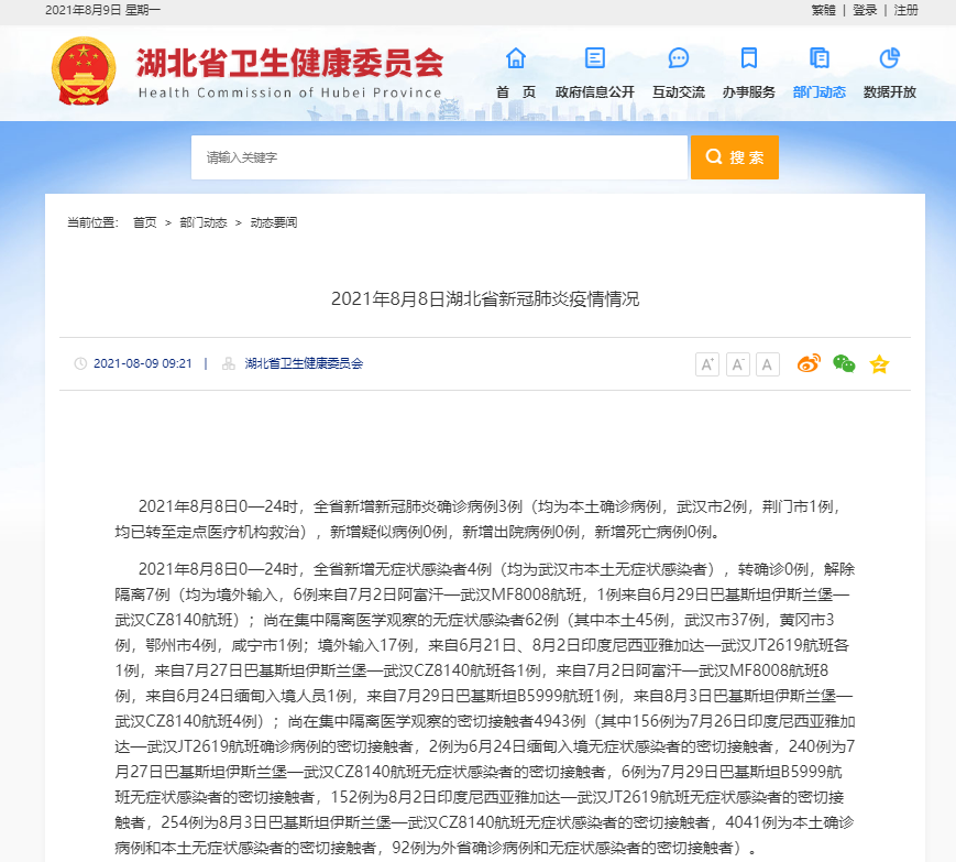 2021年8月8日0—24时,全省新增新冠肺炎确诊病例3例(均为本土确诊病例,武汉市2例,荆门市1例,均已转至定点医疗机构救治),新增疑似病例0例,新增出院病例0例,新增死亡病例0例。