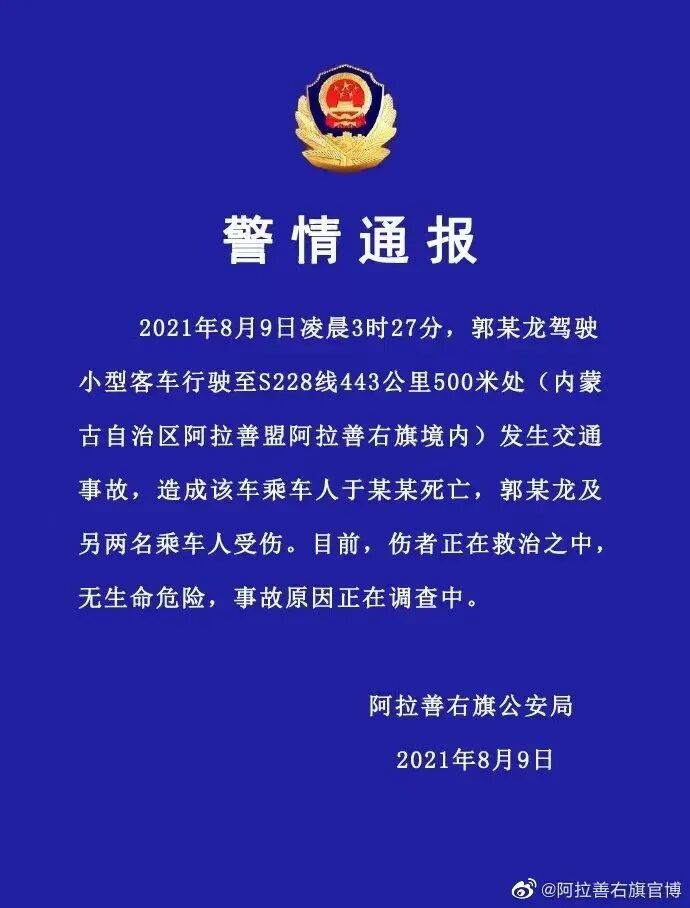 当天,内蒙古阿拉善右旗公安局发布通报称:2021年8月9日凌晨3时27分,郭某龙驾驶小型客车行驶至S228线443公里500米处(内蒙古自治区阿拉善盟阿拉善右旗境内)发生交通事故,造成该车乘车人于某某死亡,郭某龙及另两名乘车人受伤。目前,伤者正在救治之中,无生命危险,事故原因正在调查中。