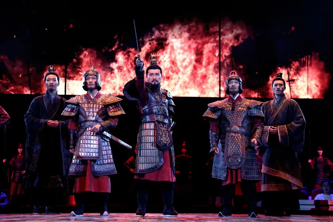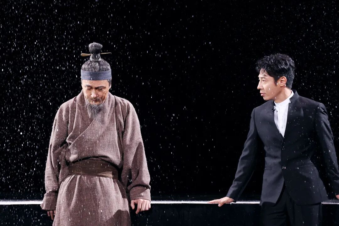 在张力十足的舞台空间里,许多场景令人难忘:宏大如金戈铁马的柏举之战,细腻如伍子胥推开草屋门喊出的一声“长卿”、孙武一路小跑端上的一碗热粥,动人如漫天飞雪中撒贝宁双眼饱含的热泪,高燃如《孙子兵法》跨越时空、连接千年的齐诵……