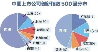 报告显示,创新指数上榜企业存在明显的区域集中趋势。创新指数500强公司总部在分布上主要集中于上海(56)、北京(50)、深圳(39)、杭州(30)、广州(18)、南京(14),共有207家分布在这六个城市。广东省共有81家500强创新企业,连续三年蝉联第一,排名靠前的省份还有浙江省(75家)、江苏省(59家)、山东省(39家)和福建省(19家)等。
