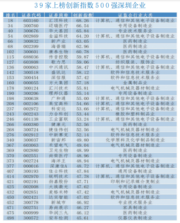 今年深圳有39家企业上榜创新500强数量仅次于上海和北京其中,坪山区有7家企业上榜分别是新产业、海普瑞(生产基地在坪山)理邦仪器、健康元(生产基地在坪山)捷佳伟创、新宙邦、佳士科技。
