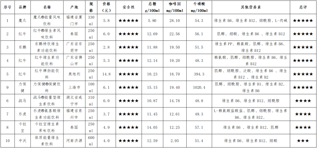 附:功能性饮料比较试验测评产品信息及评级表(点开查看大图)