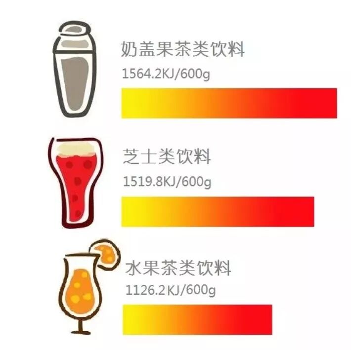 如果同样的600g水果茶类饮料、有奶盖果茶、芝士类饮料相比,水果茶饮料的热量低了近400KJ(即95.6千卡)。