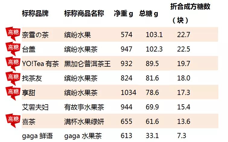 如此区分,我们检测出8款水果茶中6款属于高糖饮料,喜茶是未测出甜味剂的水果茶里面糖分最低的,详细如下表↓