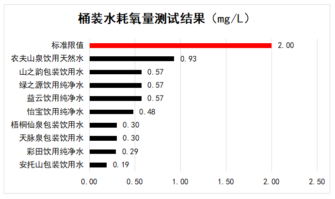 1. 耗氧量反映饮用水受有机物污染的程度,是评价桶装水受有机物污染总量的一项综合指标。国家标准GB 19298耗氧量的标准要求是≤2mg/L,测试结果表明,所有饮用纯净桶装水和其它饮用桶装水耗氧量均符合标准要求,安托山、彩田、天脉泉和梧桐仙泉包装饮用水受有机污染更少。
