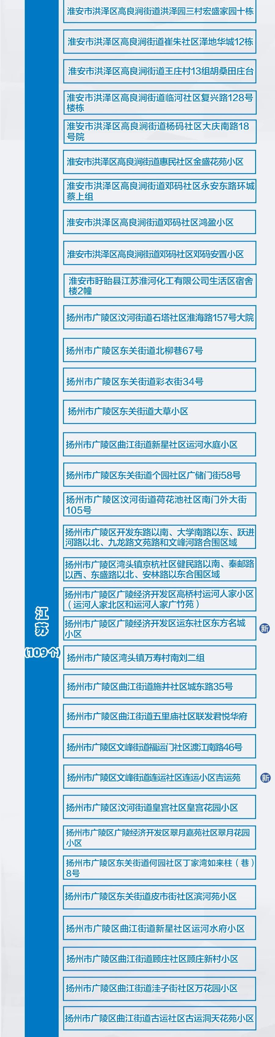 1、扬州市广陵区汤汪乡同心村(原中风险地区扬州市广陵区汤汪乡同心村新庄组并入);