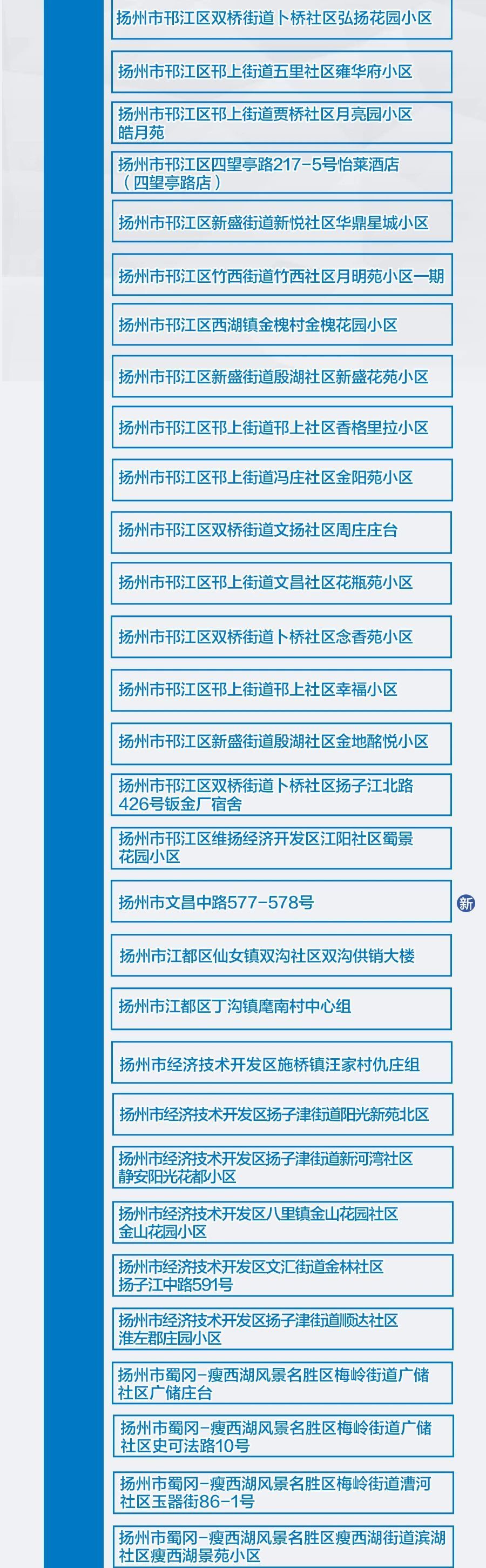 根据国务院联防联控机制《关于调整新冠肺炎疫情分区分级标准实施精准管控措施的通知》(国电发〔2020〕11号)要求,经扬州市新冠肺炎疫情防控工作指挥部研究,自发布之日起,对扬州市部分区域疫情风险等级进行调整:
