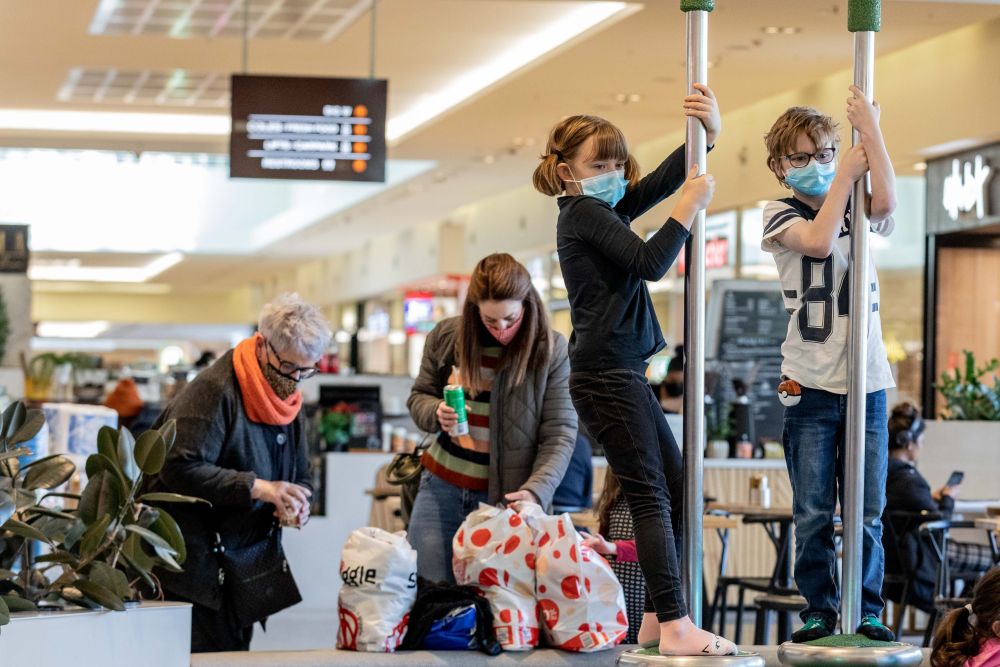 6月28日,戴口罩的儿童在澳大利亚堪培拉一家商场内玩耍。为遏制新冠变异病毒德尔塔毒株进一步蔓延,当地政府宣布从28日起实施在公共场所强制戴口罩的防疫规定。(新华社发,储晨摄)