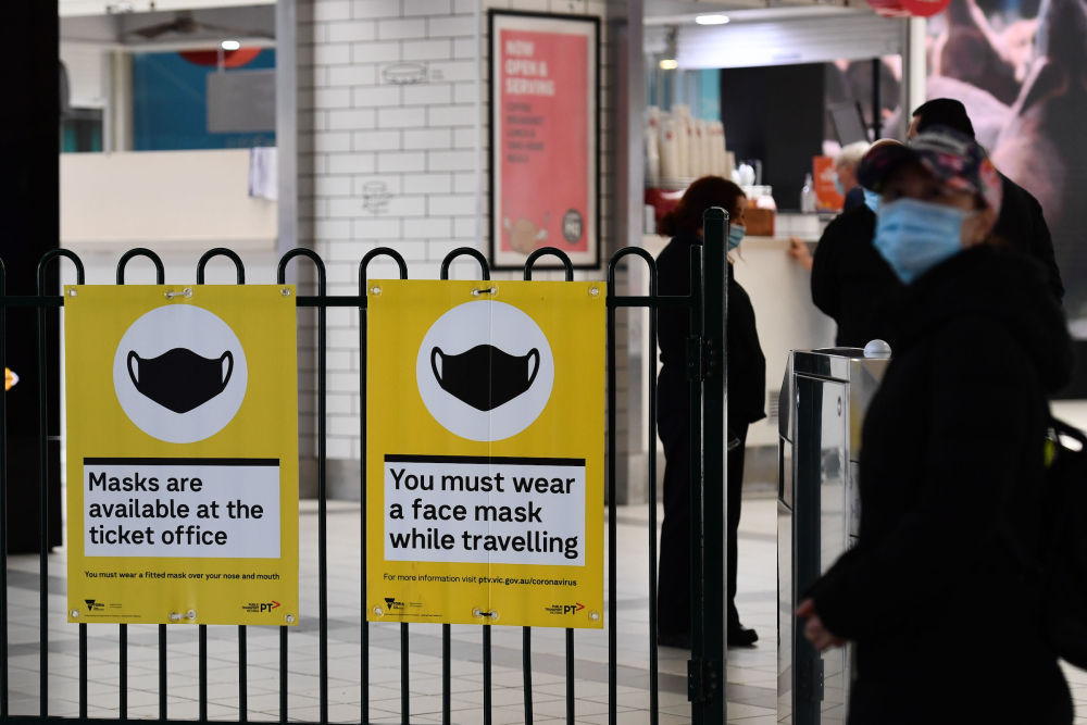 5月28日,在澳大利亚墨尔本,火车站的栅栏上悬挂着提示人们佩戴口罩的标示。(新华社发,白雪摄)