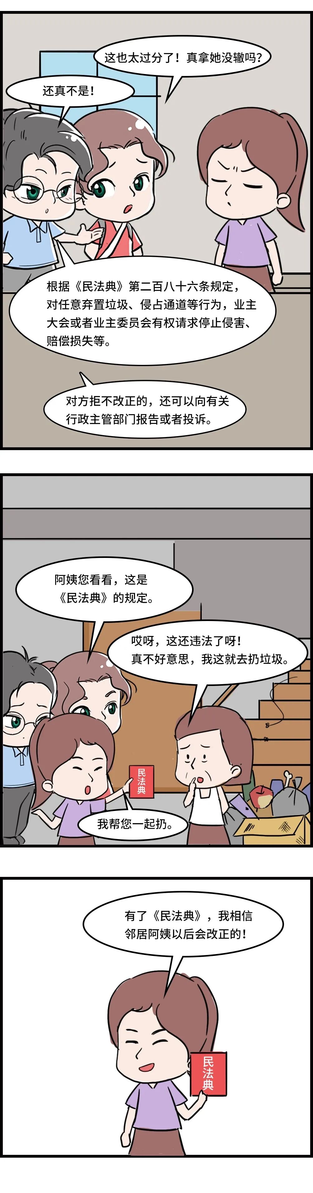 自家门口不是垃圾桶,根据《民法典》规定,任意弃置垃圾、侵占通道等行为侵犯了其他业主的合法权益。更何况,随意堆放垃圾不仅影响卫生与美观,还存在一定的安全隐患,保持整洁,利己利人!