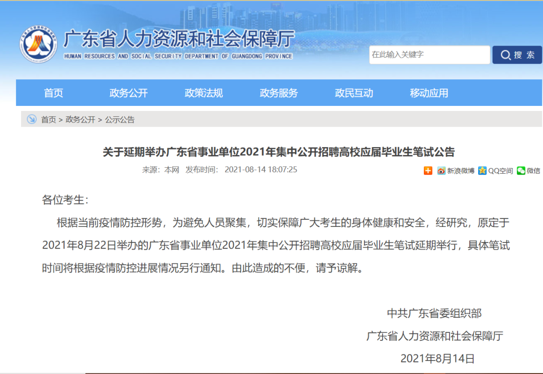 关于延期举办广东省事业单位2021年集中公开招聘高校应届毕业生笔试公告