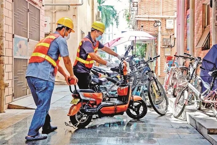 图为凤凰街道工作人员清理乱停放的电动自行车。