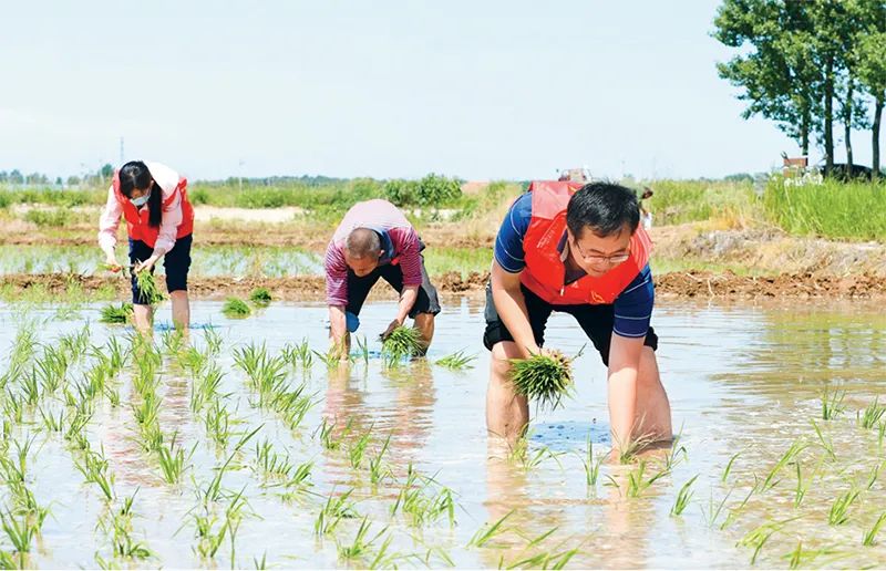 山东省烟台市海阳市把党史学习教育与群众所需所盼相结合,将“我为群众办实事”实践活动落实到田间地头。图为2021年6月21日,龙山街道的党员、干部在西沽头村稻田里帮农户插秧。 山东省委组织部供图 李乃杰、徐艺/摄