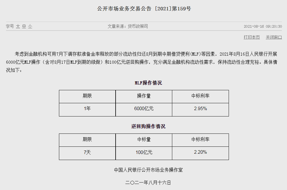央行公告称,考虑到金融机构可用7月下调存款准备金率释放的部分流动性归还8月到期中期借贷便利(MLF)等因素,16日人民银行开展6000亿元MLF操作(含对8月17日MLF到期的续做)和100亿元逆回购操作,充分满足金融机构流动性需求,保持流动性合理充裕。