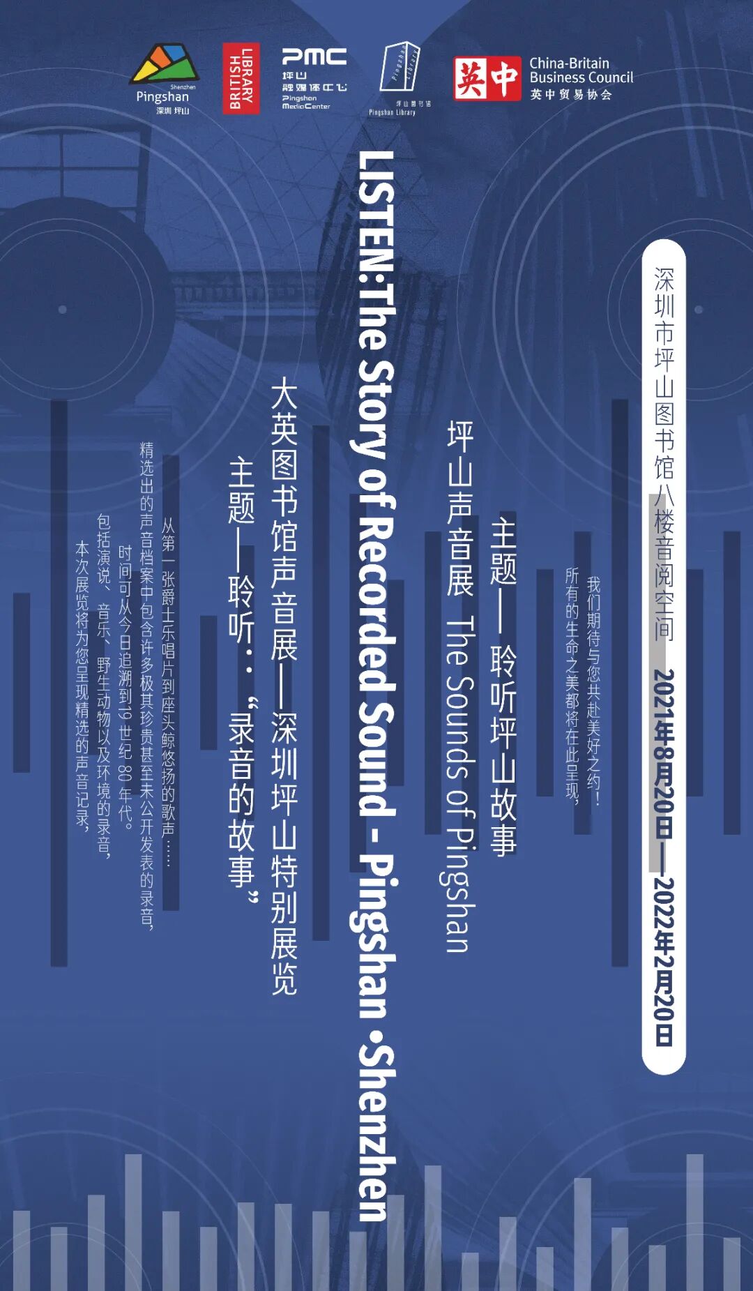 8月20日,大英图书馆声音展深圳坪山特别展览开幕式暨2021年“坪山之声”计划发布仪式将在坪山图书馆举行。大英图书馆的展览“聆听:录音的故事”首次在海外“发声”,深圳市坪山区也将以声音的形式,发出嘹亮“回响”——在坪山听见世界,让世界聆听创新坪山!