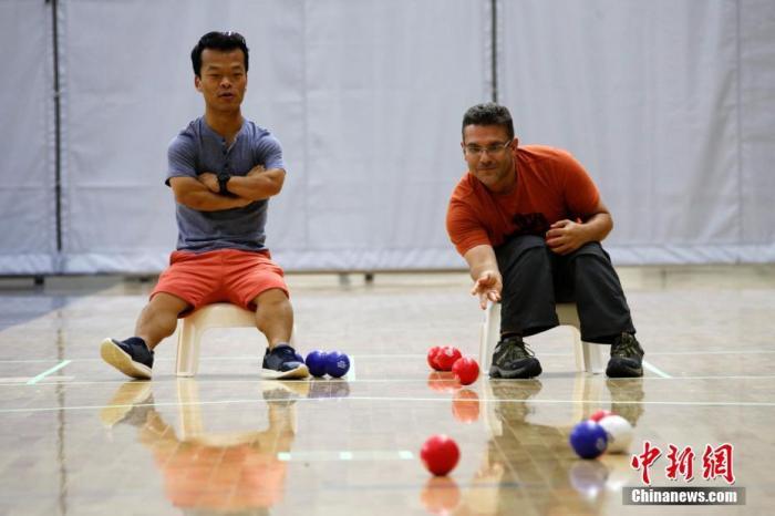 资料图:两名运动员在比赛间歇进行室内硬地滚球练习。 中新社记者 余瑞冬 摄