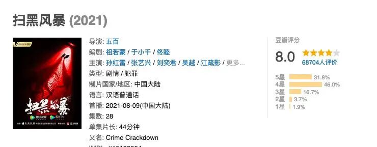 根据真实案例改编的电视剧《扫黑风暴》开播不久就收获了一片好评。有消息称,《扫黑风暴》在腾讯视频上线6小时播放量就破亿,其开播以来持续位列腾讯视频热搜总榜第一名,豆瓣开分8.0。