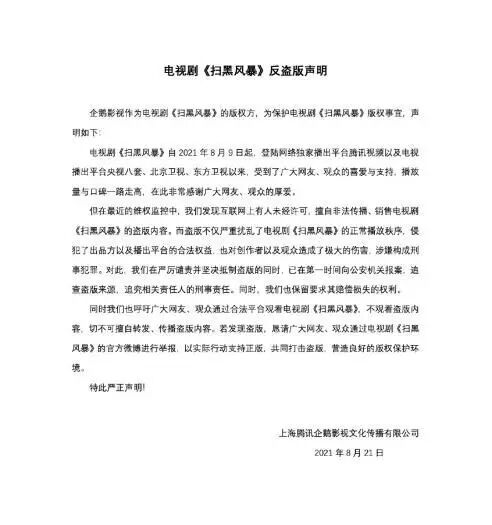 对此,《扫黑风暴》官方微博8月21日发布了一则“反盗版声明”。呼吁网友、观众通过合法平台观看电视剧《扫黑风暴》,不观看盗版内容,切不可擅自转发、传播盗版内容。随后,腾讯视频宣布“已报警”。