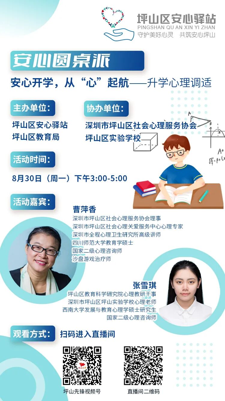 新学年开启,从相对自由的暑假生活回到有规律的学校生活,加上面临升学压力,学生容易出现不同程度的心理问题和情绪波动,为深入推动安心行动 II进校园,做好学生心理健康教育工作,营造健康和谐的学习和成长环境,帮助学生缓解心理压力,以最好的状态投入到开学后的学习和生活中,坪山区安心驿站、坪山区教育局于08月30日(周一)开展安心开学,从“心”起航——升学心理调适系列活动。