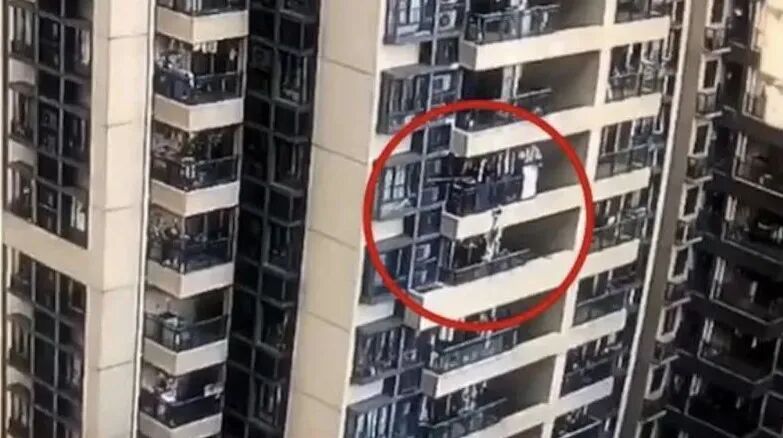 事发楼的对面楼监控显示,28日,一名孩童挂在22层的黑色防护栏外,随后不久,悲剧发生。