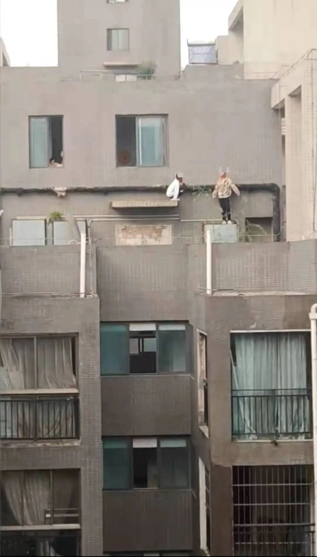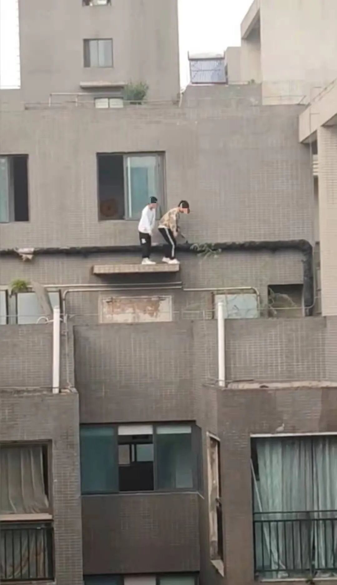 在等电梯时无意间看到对面顶楼墙外有两个孩子