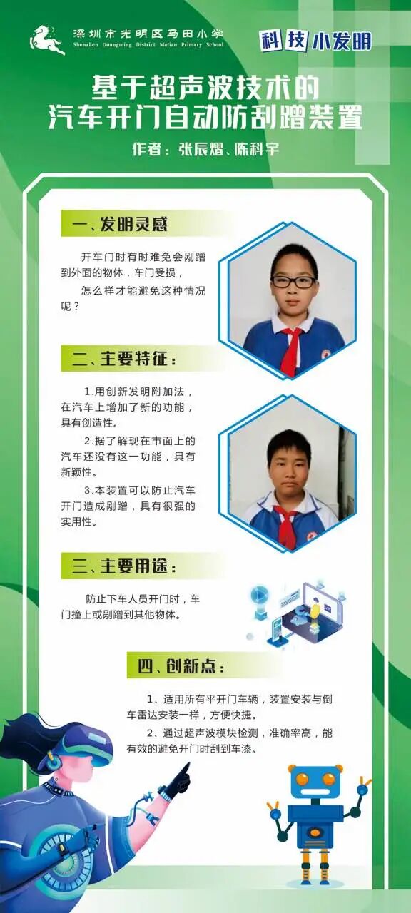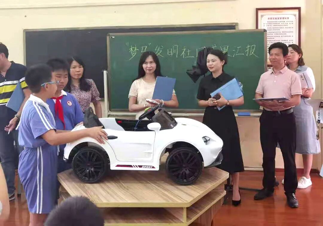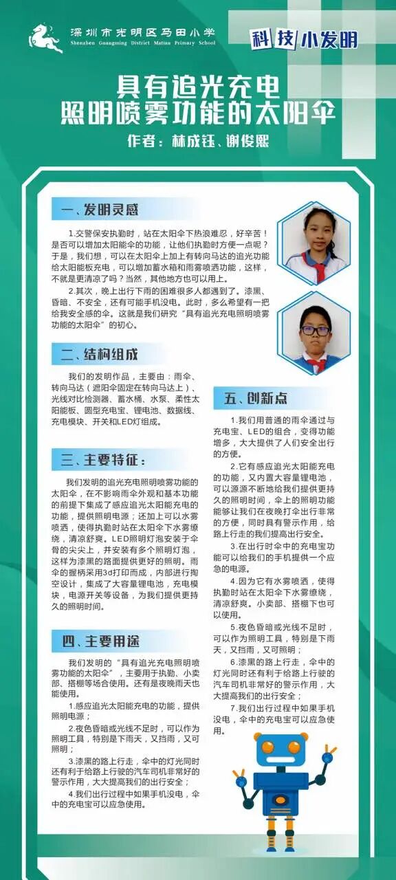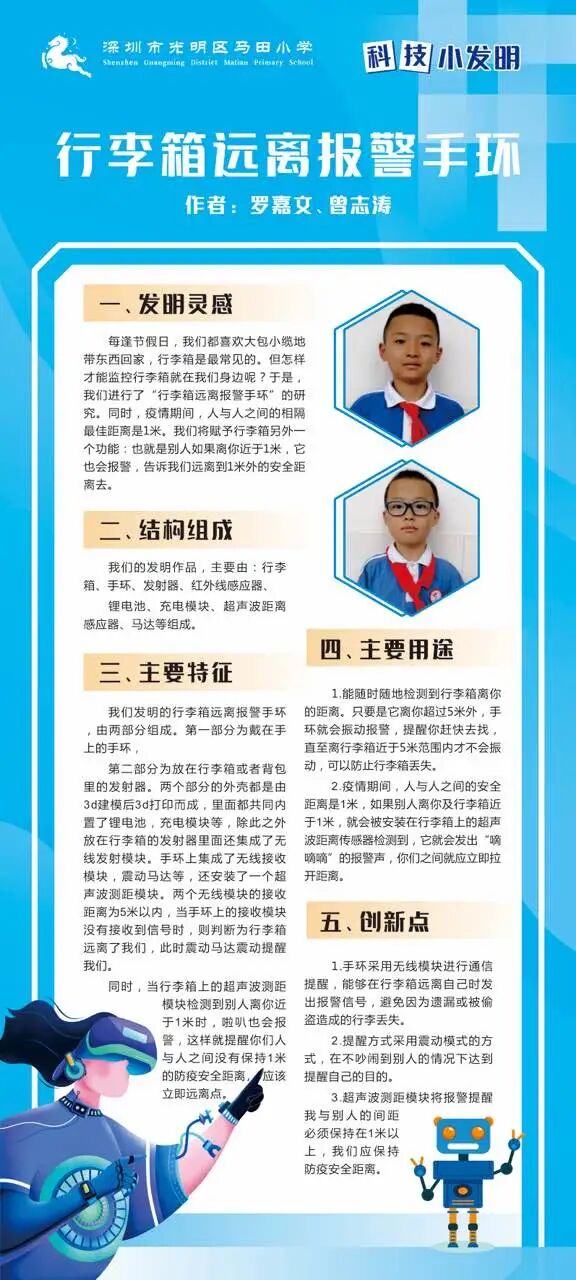 此次全国青少年创造力发明展上,马田小学6位学生在激烈的角逐中脱颖而出。其中,获得金奖的作品有:五(4)班林成钰、四(4)班谢峻熙两位同学作品《具有追光充电照明喷雾功能的太阳伞》、五(1)班罗嘉文、四(5班)曾志涛两位同学作品《行李箱远离报警手环》、四(3)班罗子阳同学的作品《防后仰倒的椅子》。获得银奖的作品有:五2班张辰熠同学的《基于超声波技术的汽车开门自动防刮蹭装置》。比赛中,6名小学生的小发明作品独特新颖,具有创造性精神,得到评委老师的肯定与点赞。蔡太平、江建妹老师荣获“优秀创新辅导教师”奖。