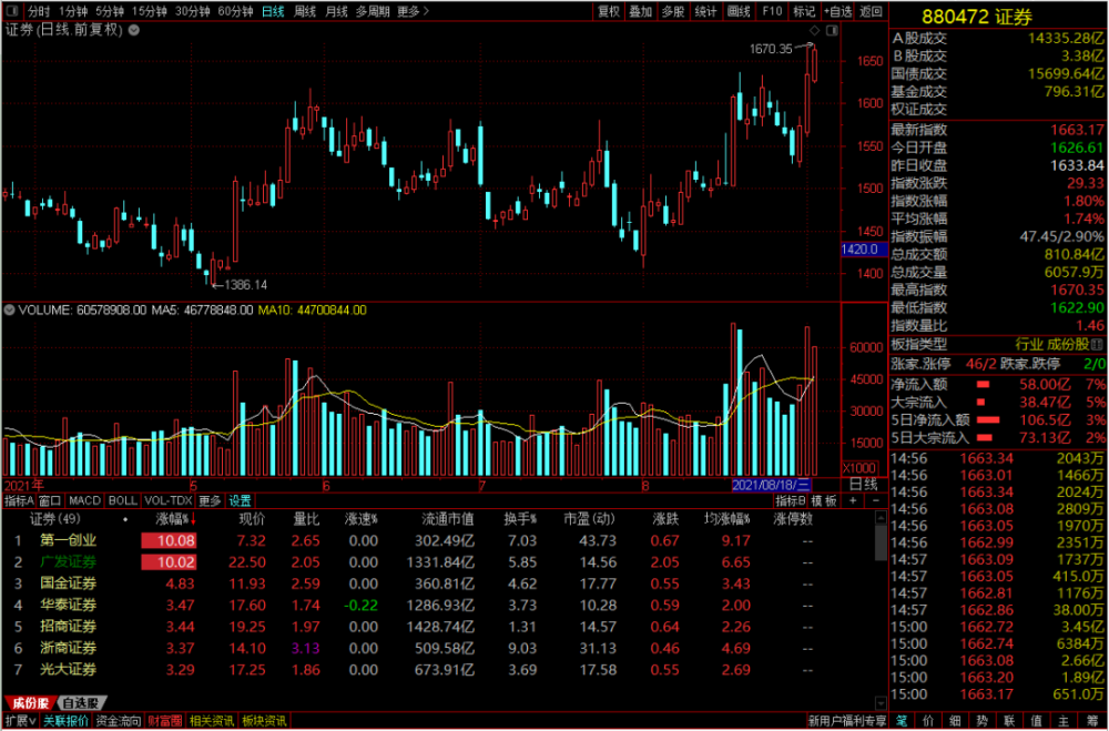 近期,证券、创投板块异动不断,板块内个股“接力”涨停。具体来看,证券板块指数在最近3个交易日涨幅接近8%。第一创业、广发证券在9月2日涨停;浙商证券、中信建投在9月1日涨停。
