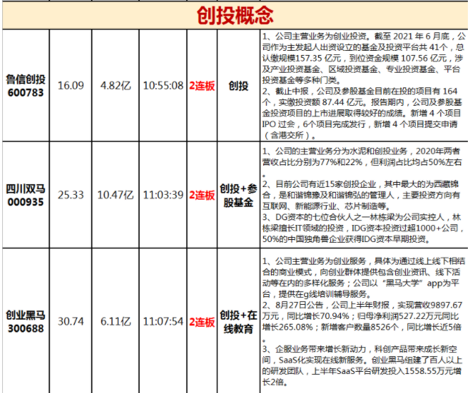 创投概念股涨停的现象则更为“密集”。截至9月2日收盘,鲁信创投、四川双马、创业黑马等3只个股实现2连板。