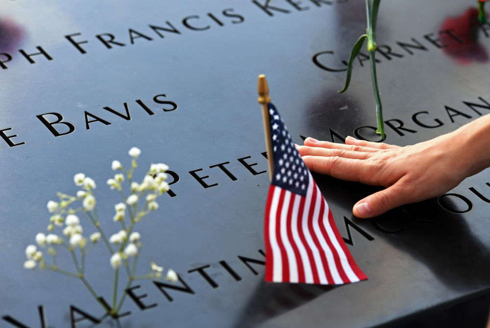 2019年9月11日,“9·11”事件18周年纪念日,在美国纽约的“9·11”纪念广场,一名女子轻抚纪念牌上镶嵌的遇难者姓名。(新华社记者李睿摄)