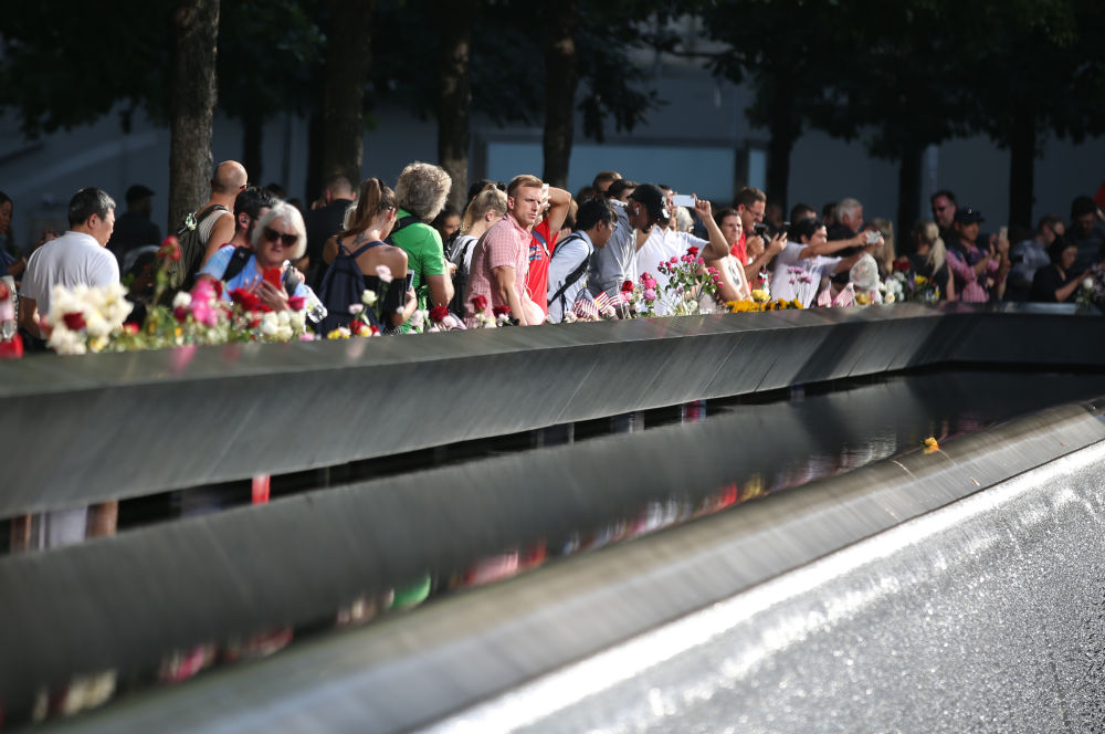 2019年9月11日,在美国纽约的“9·11”纪念广场,人们在刻有遇难者姓名的纪念池旁悼念遇难者。(新华社记者秦朗摄)