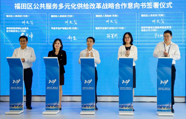 活动现场,福田区委常委、副区长叶文戈,与国家开发银行深圳分行、平安不动产有限公司、深圳市基础设施投资基金及深圳市政府和社会资本合作事务中心等代表共同签署战略合作意向书,达成共识、强强联合,共同推动深圳市福田区公共服务高质量发展,开启政企合作新篇章。