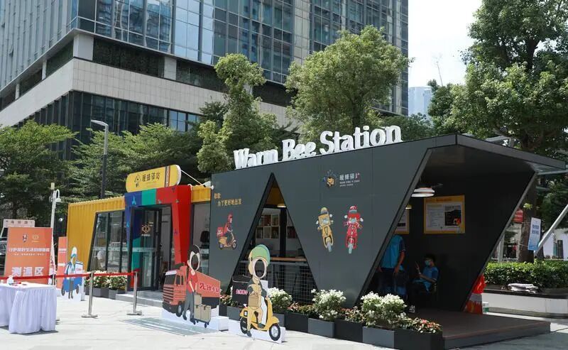 以蜜蜂身上的黄色、黑色为主色调,由两个集装箱创意组合而成,突出“归巢”即家的主题风格……在壹方城购物中心外的广场上,新安街道商圈“暖蜂驿站”格外引人注目。这也是深圳首个商圈“暖蜂驿站”。