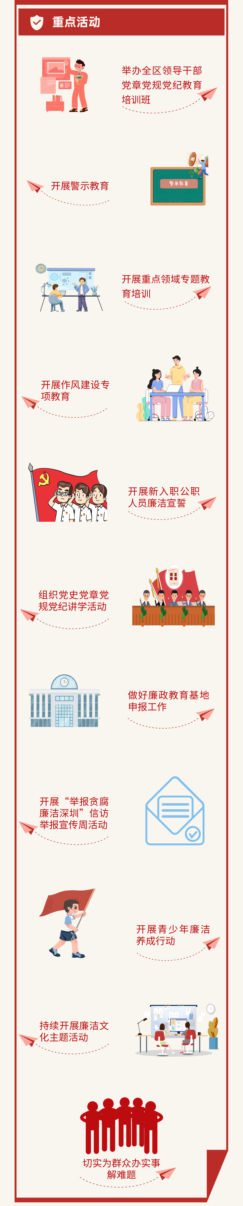 9、开展青少年廉洁养成行动——面向全区青年党员干部和青少年深入开展思想道德教育、党纪国法教育、廉洁价值培育、廉洁自律倡议,教育引导广大青少年养成崇尚廉洁、弘扬正气的品格。
