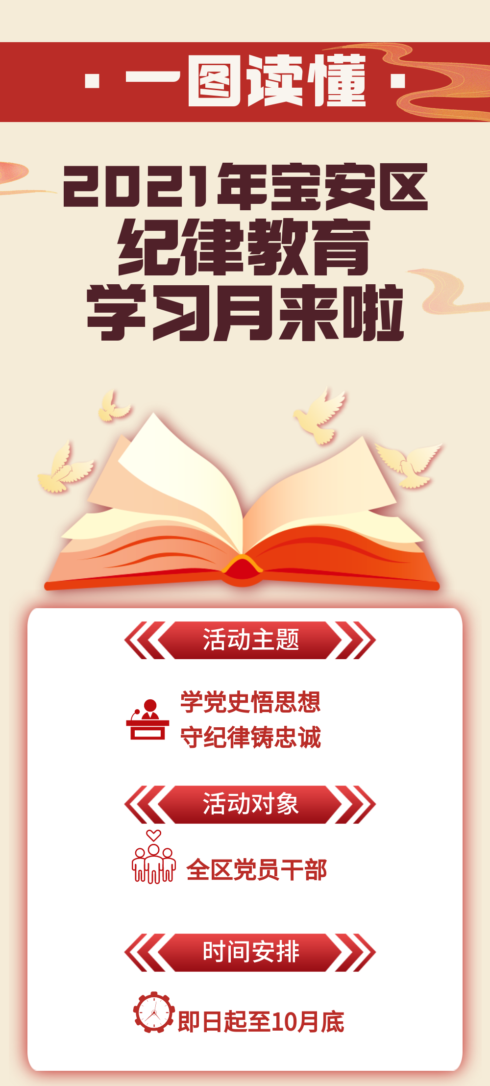 日前,深圳市宝安区委办公室印发《宝安区2021年纪律教育学习月活动方案》(以下简称《方案》),标志着2021年宝安区纪律教育学习月活动正式启动。即日起至10月底,全区各级各部门将以“学党史悟思想,守纪律铸忠诚”为主题,广泛开展纪律教育和纪律学习。
