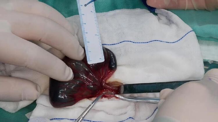 在小儿外科和新生儿科专家经过3个小时的“战斗”,患儿在完全麻醉、全程生命支持及监护和保暖的条件下成功完成手术。手术确认患儿小肠闭锁,近端已极度扩张直径超过3厘米,而远端则十分细小直径仅0.5厘米。