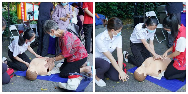 急诊科医护人员现场教学演示心肺复苏的操作步骤及正确方法,居民们踊跃参与、认真学习,增强了预防意识,提高了对突发事件和意外伤害的应变能力。