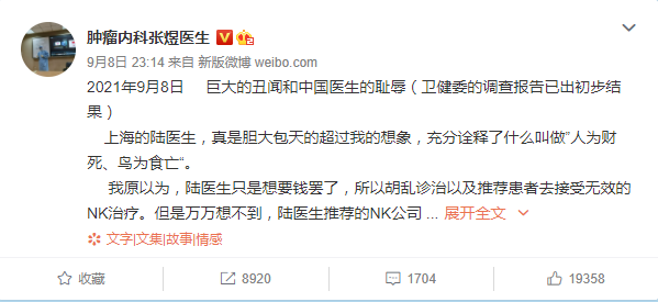 当晚,最早曝光“肿瘤治疗黑幕”的北京医生张煜也再次发声称,涉事医生陆某和嘉慷公司对患者的诊疗行为涉及诈骗。