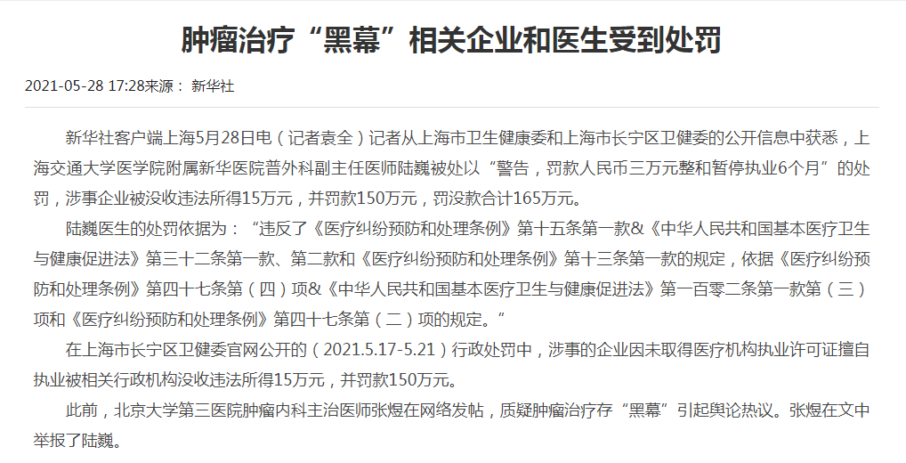 2021年5月,上海市长宁区卫健委对事件中被明确指向的上海嘉慷生物工程有限公司作出行政处罚决定,对涉事医生陆某作出警告、罚款与暂停执业的处罚决定,陆某所属的上海交通大学医学院附属新华医院也被处以警告和罚款。