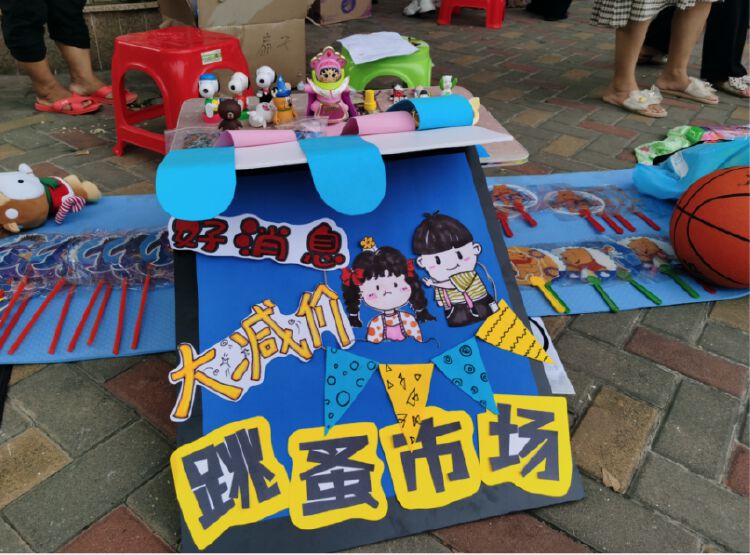 “快来看一看,便宜甩卖啦!”“这本书我可喜欢了,阿姨你可以买给弟弟看一看。”在社工的组织和带领下,跳蚤市场里叫卖声此起彼伏,商品琳琅满目,参与活动小朋友分别拿出自己从家里精挑细选的旧玩具、书籍、衣服等闲置物,整齐地摆放在自己的“小店”里,并精心布置摊位,化身“小掌柜”,热情地招揽顾客。唱歌、跳舞、展示物品……同时,他们还用尽浑身解数,充满稚嫩童趣的叫卖声引来了不少居民和小朋友驻足围观。