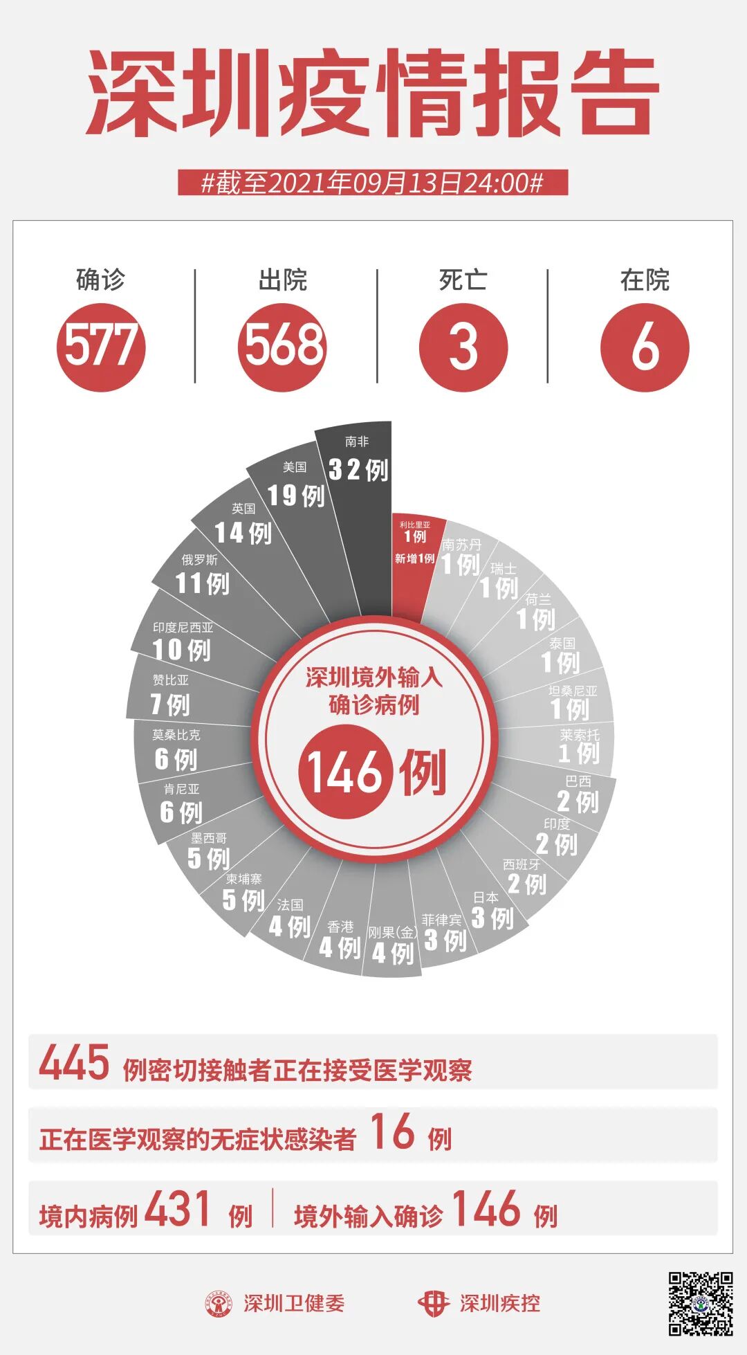 9月13日0-24时,深圳新增境外输入确诊病例和无症状感染者各1例。