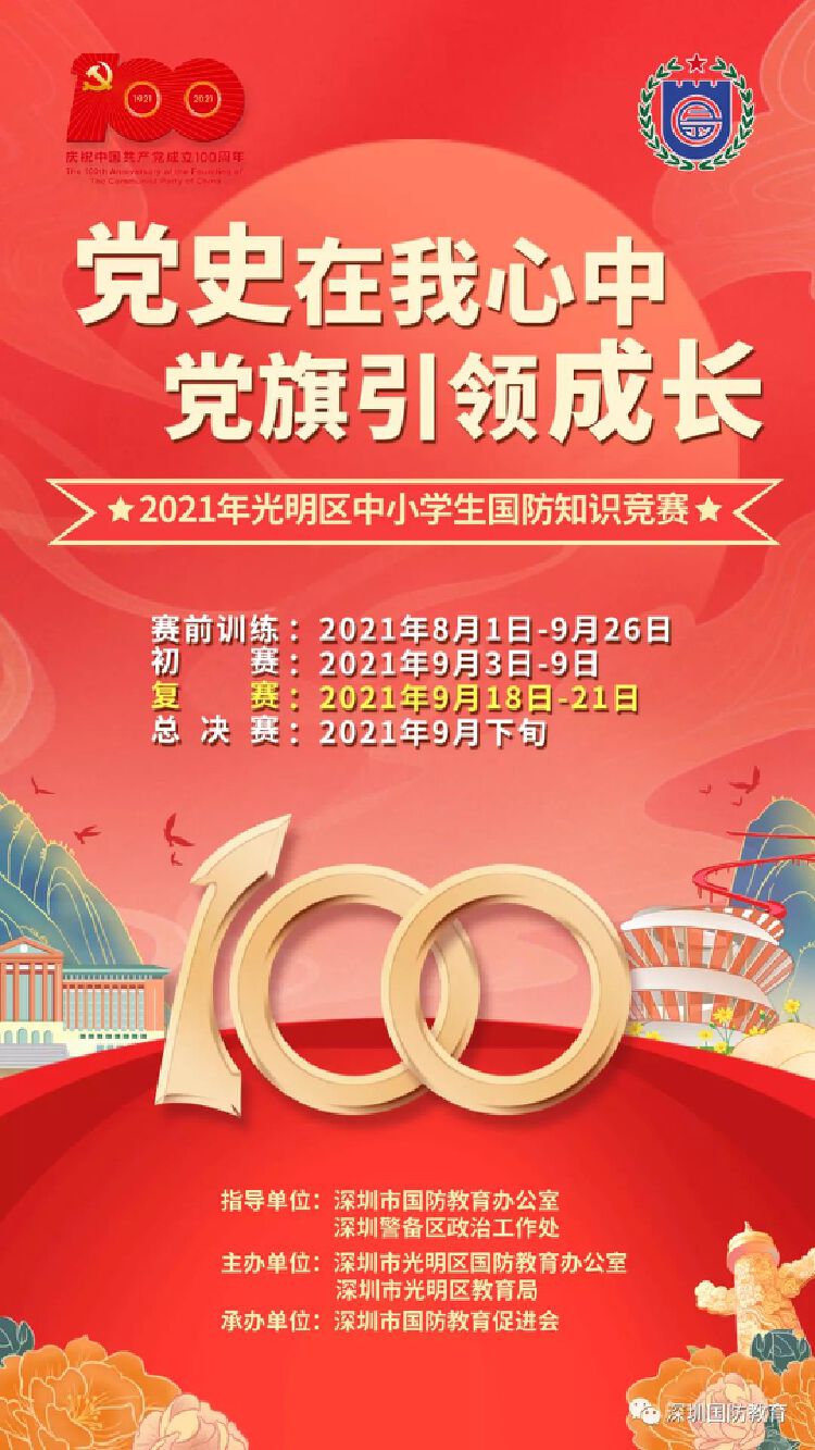 9月18日是我国第二十一个“全民国防教育日”,今年的活动主题是“迈向强国新征程,军民共筑强军梦”。为了在中小学生“拔节孕穗期”传递正能量精神养分、增强学生忧患意识、家国情怀、国防观念、和尚武精神,由光明区国防教育办公室和光明区教育局联合主办的“党史在我心中,党旗引领成长”2021年光明区中小学国防知识竞赛复赛正式开赛。