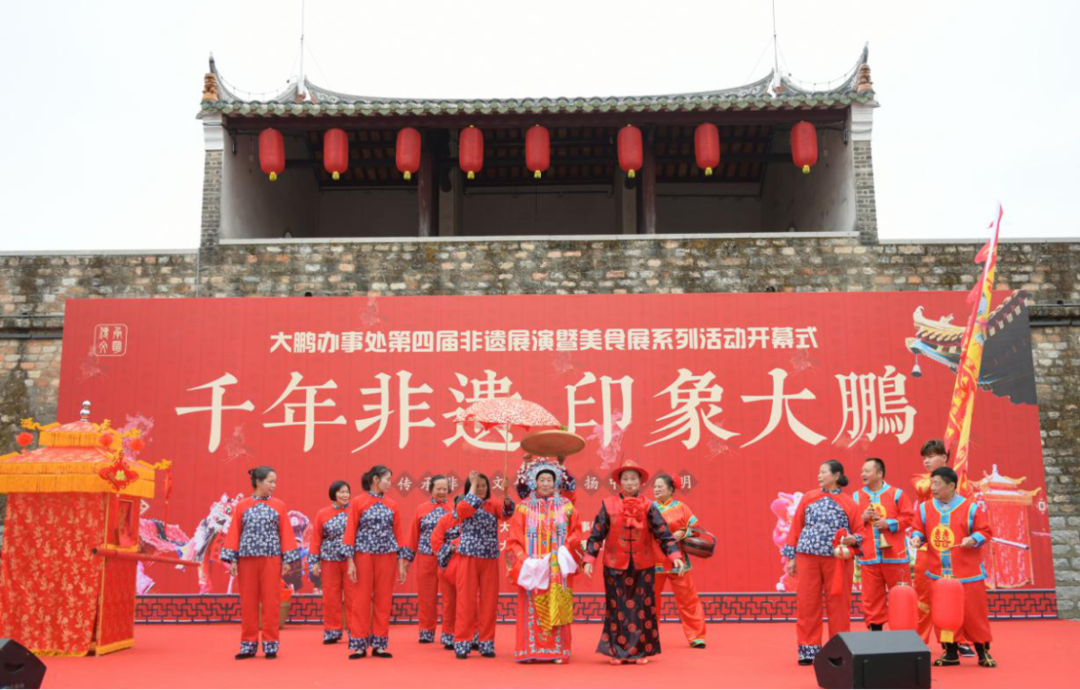大鹏新区依山伴海,坐拥全市四分之一海域和二分之一海岸线,是深圳的历史根脉,境内距今7000-6000年的咸头岭遗址是迄今发现的深圳最早有古人类活动的遗迹。截止目前,大鹏新区拥有区级及以上非物质文化遗产项目18项,其中省级4项、市级4项、区级10项。大鹏的非遗文化涉及客家、广府、军屯、疍民等多样文化类型,这些多元文化的融合交织发展,保存了深圳移民城市的雏形。大鹏的非遗项目辐射范围较广,太平清醮、舞草龙等活动举办时,大量港澳乃至海外同胞都会专程回来参加,成为大湾区文化认同的重要纽带。