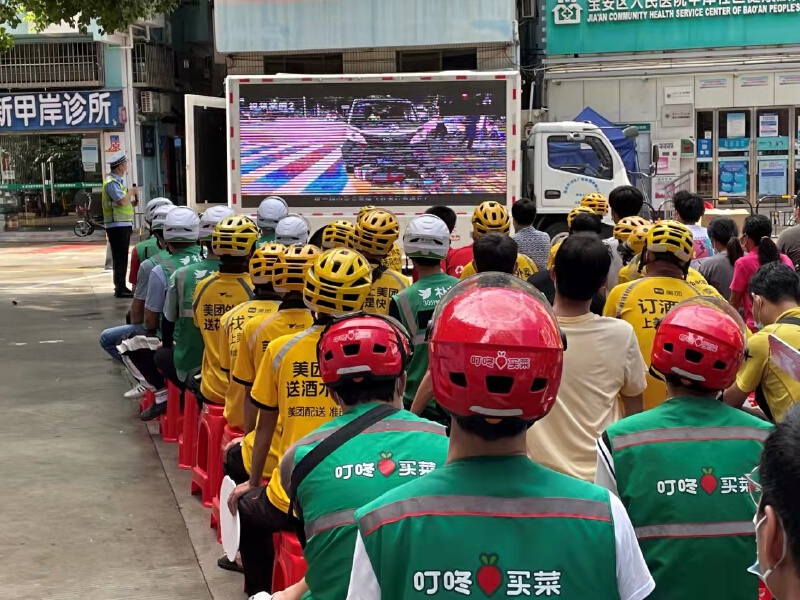 观看流动宣传车播放的电动车交通事故警示案例视频,学习法律法规