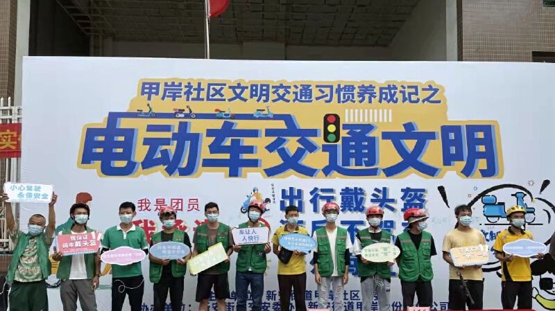 9月22日下午,新安街道甲岸社区联合街道交安委办,共同启动 “电动车文明交通习惯养成记”宣传系列活动。为期40天的系列活动将围绕“出行戴头盔、酒后不驾驶、请勿闯红灯”等电动车安全文明骑行重点要求,在甲岸社区开展全倡议、签承诺、讲案例、学法规、贴警示、暖蜂行等多项宣传和服务内容。