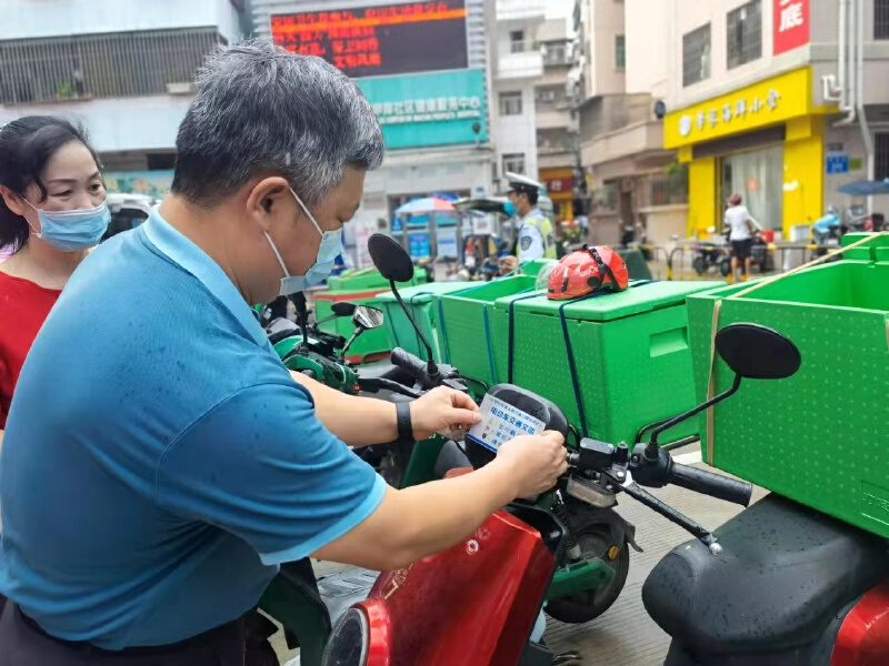 为了使“出行戴头盔、酒后不驾驶、请勿闯红灯”等电动车出行重点要求时时可见,处处可学,甲岸社区党委特别定制了3000张“电动车交通文明”反光警示牌。在启动仪式上,街道、社区工作人员和志愿者协助快递外卖小哥的电动车车头醒目位置贴上警示牌,并发放“暖蜂”慰问品。后续还将由社区工作人员带头,到甲岸村3个电动车主要出入口,为进出居民的电动车也贴上警示牌,营造出“举手投足都在讲文明”的良好氛围。