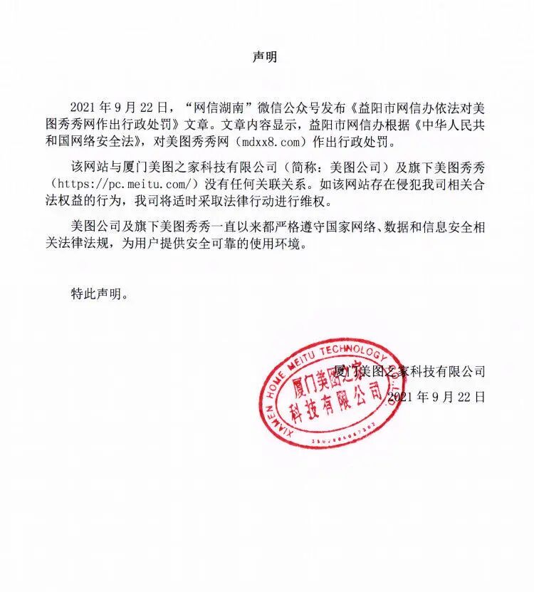 9月22日,美图秀秀官方发布声明,称与美图秀秀网没有关联。