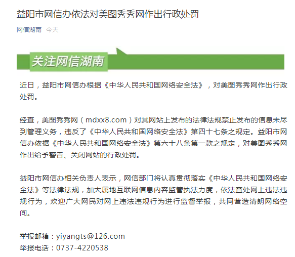 据湖南省互联网信息办公室官方微信“网信湖南”消息,近日,益阳市网信办根据《中华人民共和国网络安全法》,对美图秀秀网作出行政处罚。