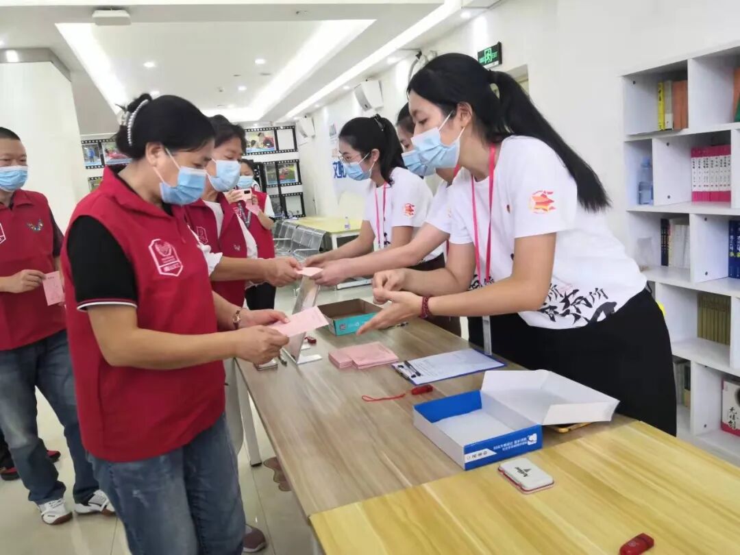 南山区义工联选区,义工们排队领取选票。(李舒瑜/图)
