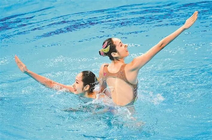 王芊懿与双胞胎姐姐王柳懿在花样游泳女子双人自由自选比赛中