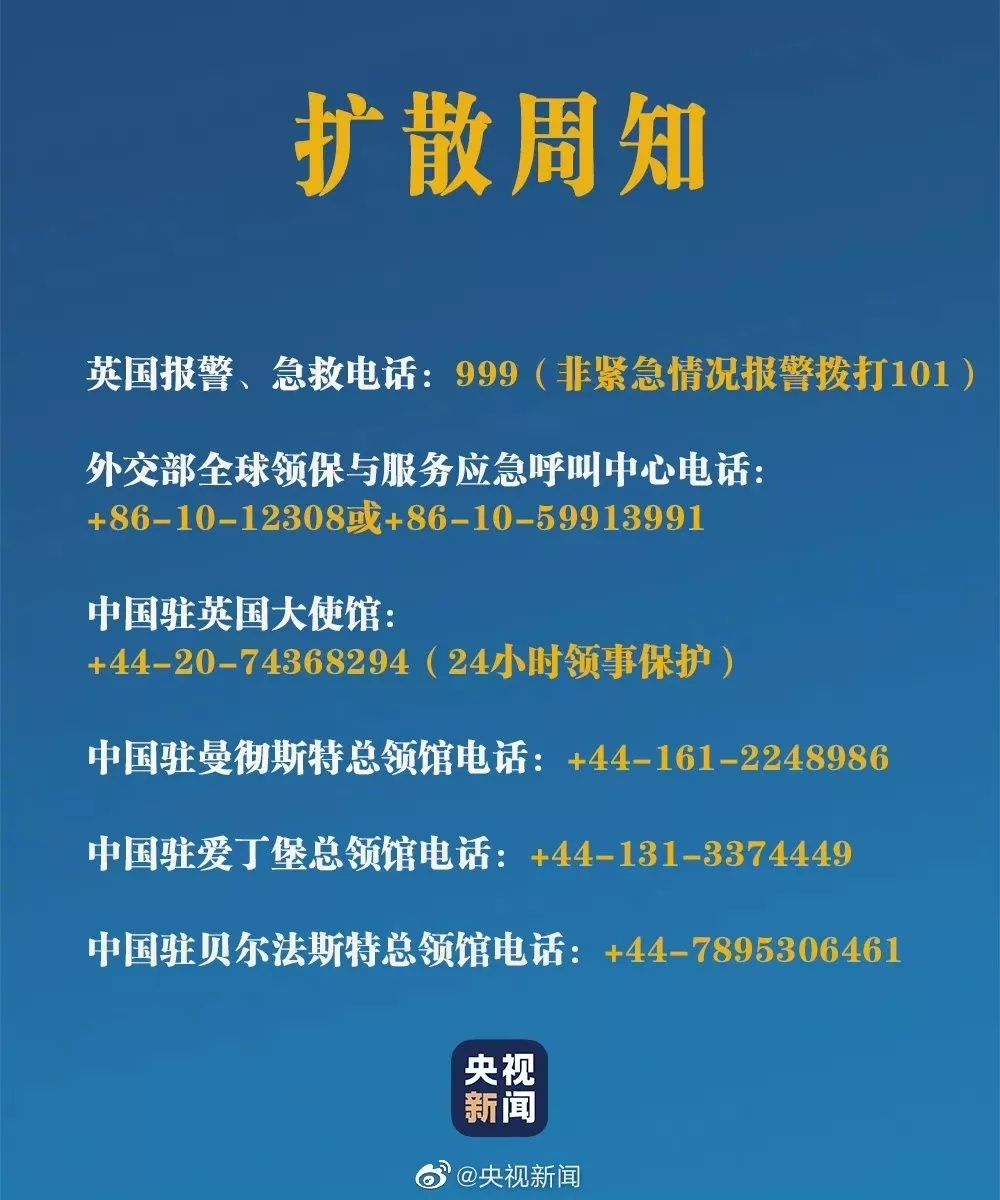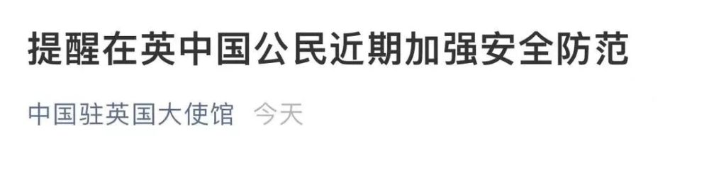 使馆提醒在英中国公民近期外出提高警惕,遇不良分子挑衅,尽快设法脱身,记住对方体貌特征并及时报警。紧急情况下请联系中国驻英国使领馆寻求协助。
